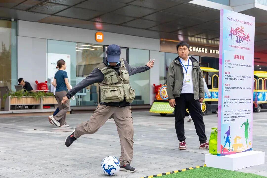 上午10点,西铁营万达广场人潮涌动。足球九宫格、足球飞镖、花式点球、足球保龄球四大趣味项目前排起长龙,欢呼声、喝彩声此起彼伏。“进了!九宫格8号区域!”伴随足球“砰”地击中目标格,围观群众爆发出热烈掌声。